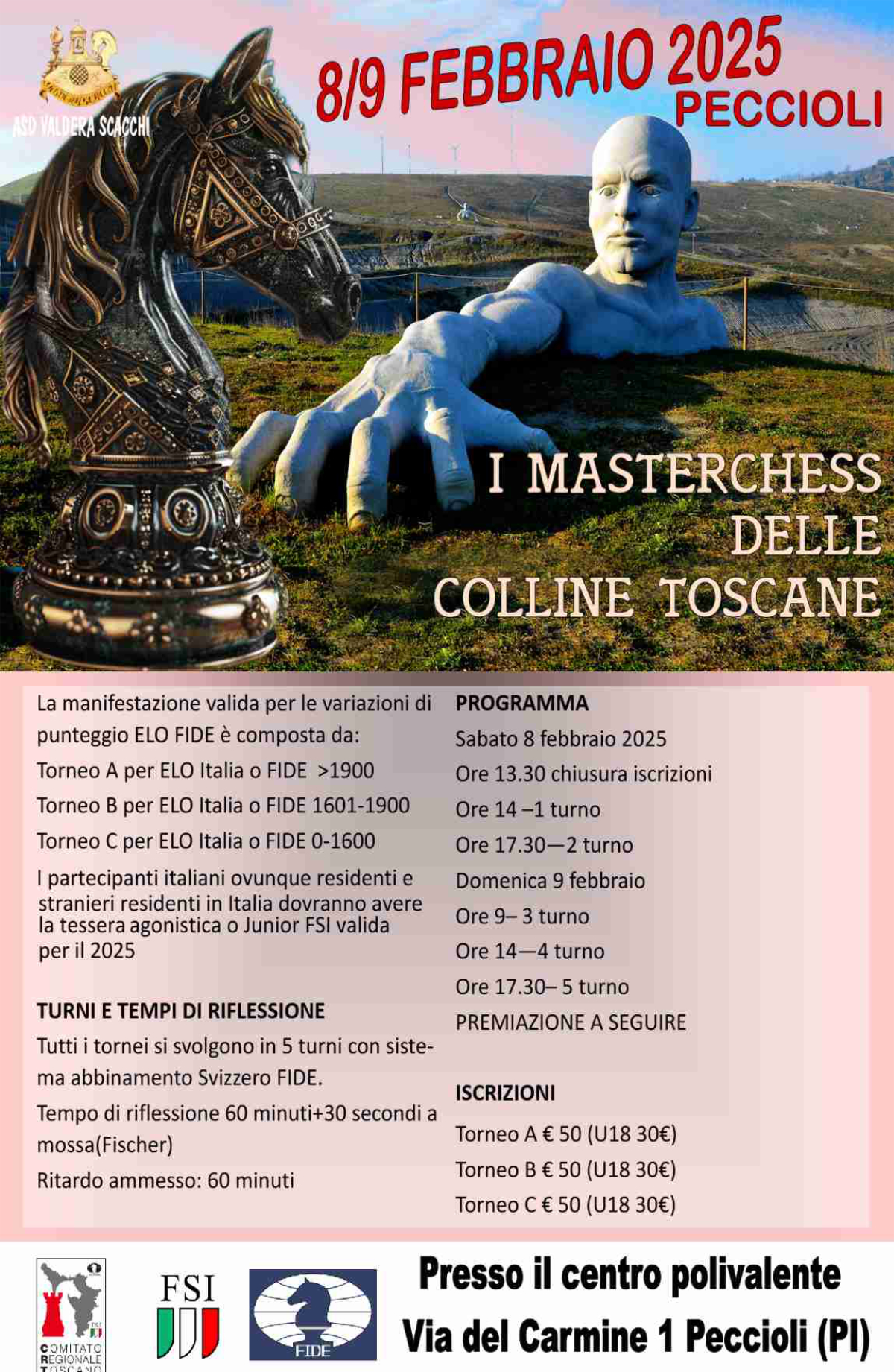 Home Standard Week-end Masterchess delle colline toscane Week-end Masterchess delle colline toscane Link vesus + Aggiungi a Google Calendar + iCal / Outlook export Data 08 - 09 Feb 2025 Scaduto Ora 13:30 - 19:00 Maggiori informazioni BANDO Luogo PISA Categoria Standard Organizzatore ASD Valdera Scacchi Condividi questo evento Cerca Nessun risultato Categorie Documenti Notizie Regolamenti Verbali Ultime novità Corsi ed Esami gli arbitri Verbale 25 settembre Finale Nazionale CIG 2025 Verbale del 17 Luglio 2025 Verbale del 13 Maggio 2025 Archivio Archivio Seleziona il mese Novembre 2025 Ottobre 2025 Settembre 2025 Luglio 2025 Maggio 2025 Marzo 2025 Febbraio 2025 Gennaio 2025 Dicembre 2024 Novembre 2024 Ottobre 2024 Settembre 2024 Novembre 2017 Novembre 2016 Novembre 2015 Novembre 2014 Novembre 2013 Gran Premio della Toscana Calendario Regionale tornei FSI Campionato Italiano a Squadre